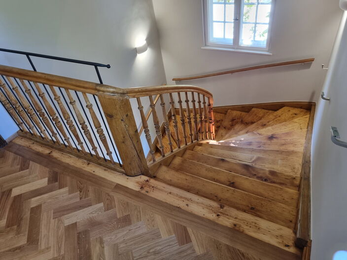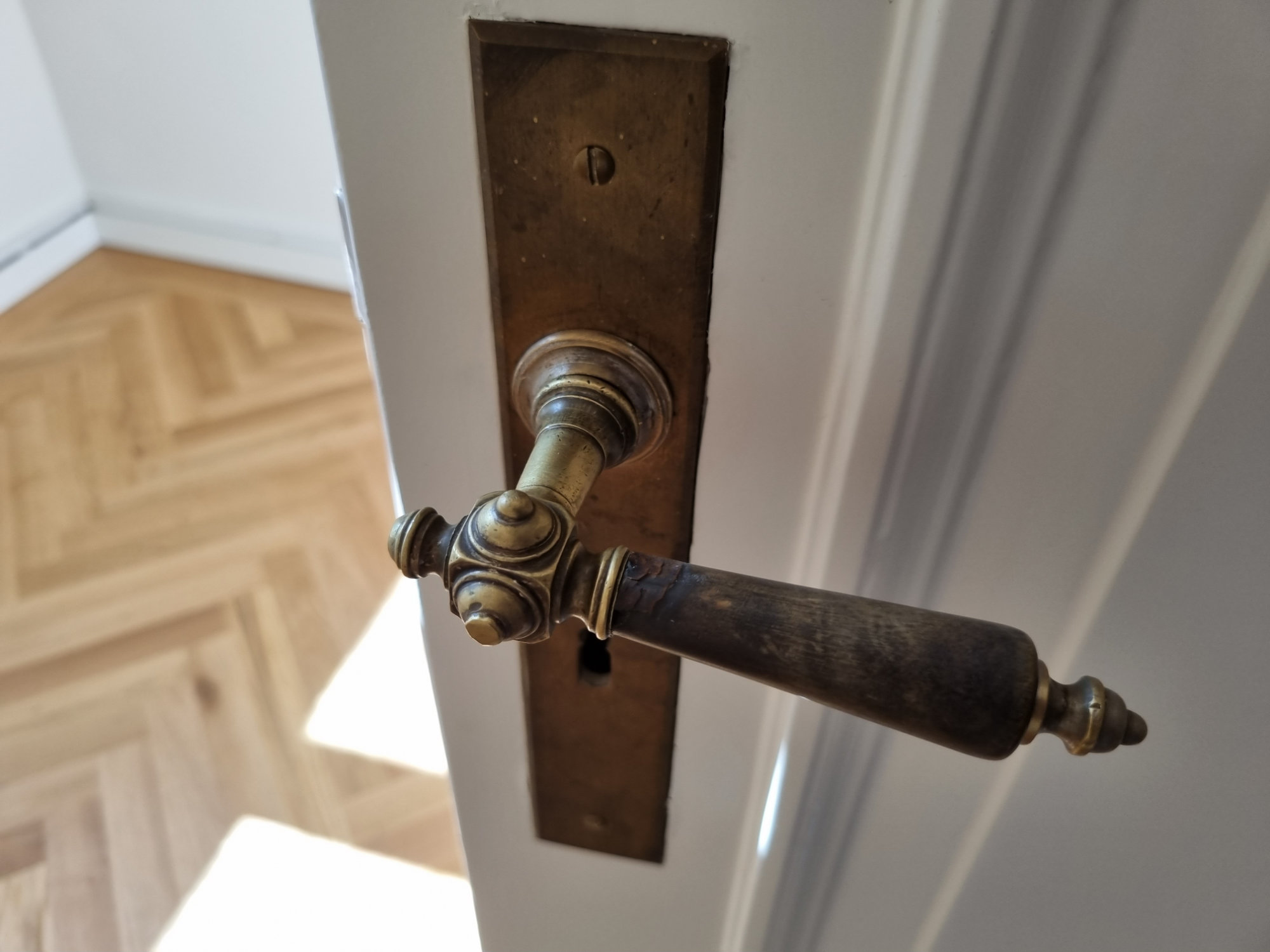 Erfreulicherweise waren auch noch einige der historischen Türen erhalten und konnten aufgearbeitet werden, wie die aufwändig verzierte Haustür und die Wohnungseingangstüren. Letztere wurden im Zuge dieser Arbeiten brandschutztechnisch ertüchtigt und erhielten nach dem historischen Vorbild angefertigte Beschläge.